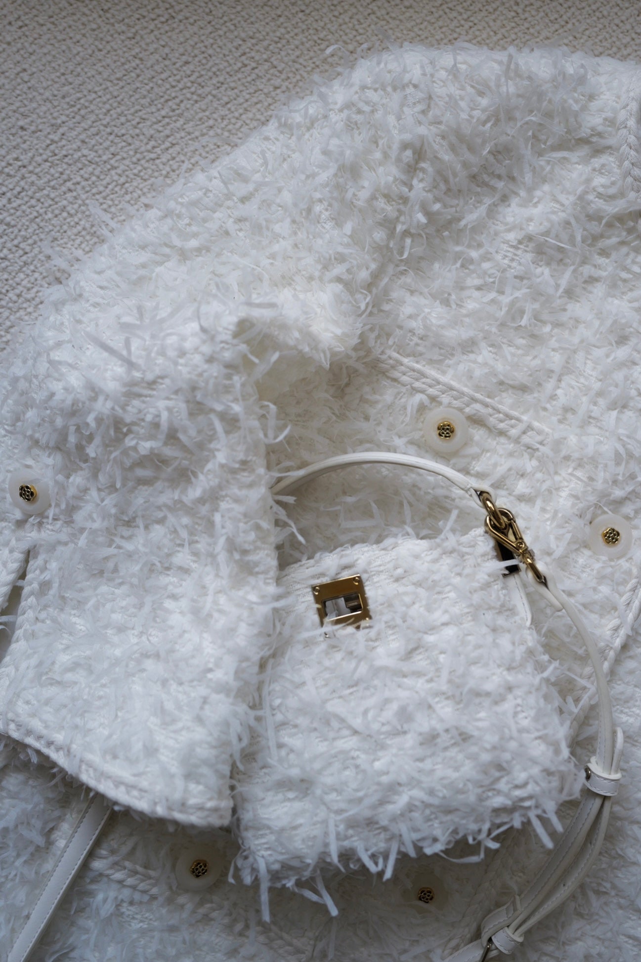 ・ゴールドモチーフが施されたボタンで、華やかさをさりげなくプラス。